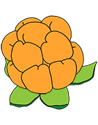 Cloudberry - Rubus chamaemorus. 'Bakeapple', anglicized from the French, 'baie qu'appelle...' meaning, 'what is this berry called..?', is internationally known as a 'Cloudberry'. It is similar in appearance to a rather large raspberry and has what some say a distinct honey/apricot-like flavour. Others claim its unique delectableness is beyond compare. The colour is orange/yellow and grows one berry to a plant approximately 3-4" high. Bakeapples are members of the rose family having close relatives such as the raspberry, blackberry, nagoonberry, and thimbleberry. Male and female flowers grow separately with each plant growing a single white, five petalled flower from the tip of the stem. The fruit is red when unripe and turns a soft golden orange at maturity. They are generally ready for picking around mid August. Bakeapples occupy a variety of moist northern tundra and peat bog habitats. These berries are extremely rich in vitamin C and contain few calories. The juice has been used to treat hives.